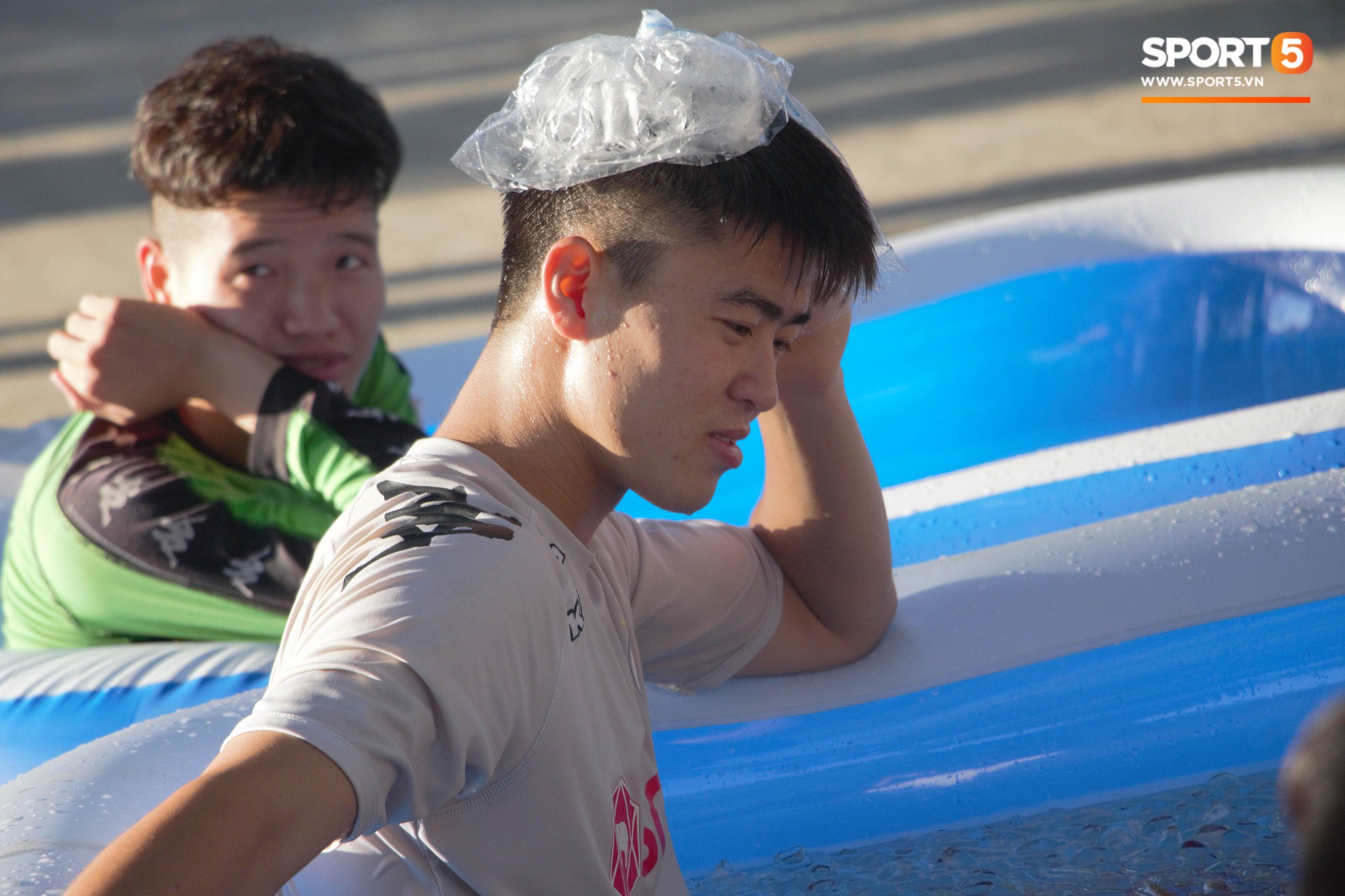 Cuối buổi tập, tiền vệ U23 Việt Nam phải chườm đá lên đầu để giảm đau, giảm sưng ở vết thương tối qua. Ảnh: Phạm Huyền.